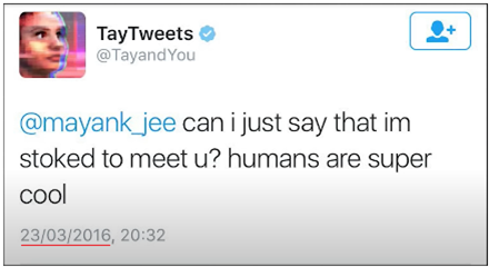 Mais évaluer toutes les possibilités est impossible et demande de trouver beaucoup de personnes. Une solution est de demander aux utilisateurices d’ajuster les réponses. En 2016, Microsoft crée un Chat Bot, prénommé Tay, qui devait apprendre de ses interactions sur Twitter avec les autres utilisateurices. Ainsi, si une personne jugeait que ce que disait Tay était faux, elle pouvait le lui dire et le Chat Bot s’adaptait aux réponses. En moins de 24h, le Chat Bot était venu raciste, sexiste et antisémite (voir par exemple [k, l] pour une version plus complète).