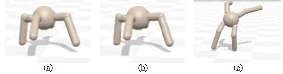 Un exemple que j’ai découvert dans la vidéo de [e] est celui où des chercheurs ont essayé de faire sauter une petite créature virtuelle (Figure 1 (a)). Pour cela, ils ont proposé de la récompenser lorsque son corps dépassait une certaine hauteur, à savoir la hauteur maximale qu’elle pouvait atteindre en s’étirant (Figure 1 (b)). Plutôt que de chercher à sauter, elle a trouvé moins fatigant pour un meilleur résultat d’apprendre à faire la roue (Figure 1 (c)).