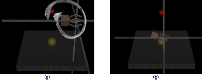 Un autre exemple est celui d’une main robotique virtuelle qui devait attraper une balle jaune (Figure 2 (a). Plutôt que d’attraper cette dernière, elle s’est placée de telle sorte qu’un observateur extérieur ait l’impression qu’elle ait attrapé la balle (Figure 2 (b)).