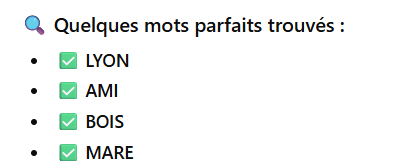 J’actualise ma liste de mots parfaits. Elle contient désormais :