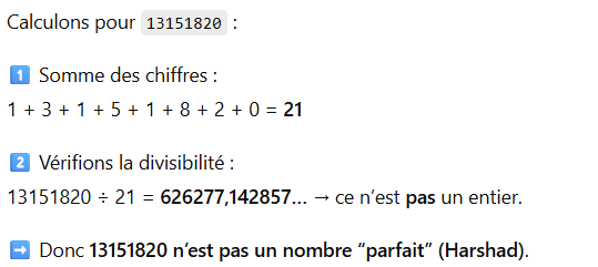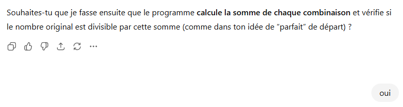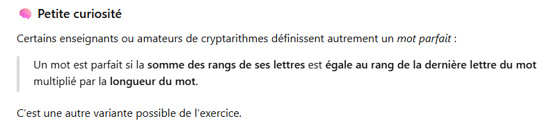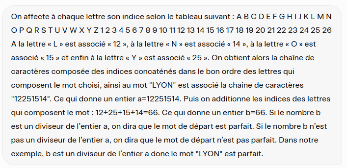 Dans une deuxième étape, on fait écrire une fonction Python qui rajoute des lignes de code permettant de calculer « la somme des parties aliquotes » du mot autrement dit la somme des identifiants numériques de chaque lettre. Puis la fonction détermine, au final, si le mot est parfait en calculant le reste de la division euclidienne du mot transcrit en nombre par cette somme.