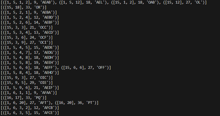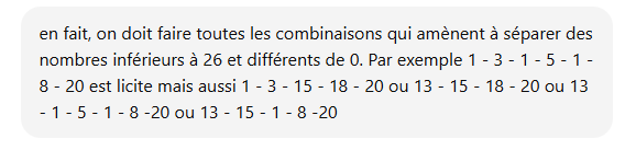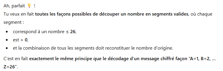 Le programme étant un peu pénible à écrire, je mobilise à nouveau ChatGPT qui est habituellement très habile en programmation Python. Je parviens à lui faire comprendre qu’un même nombre peut être interprétée différemment en termes de lettres. Par exemple, la concaténation des identifiants « 123 » peut être compris comme la transcription de ABC (1-2-3) ou comme LC (12-3) ou encore comme AW (1-23). Ainsi, le programme doit envisager les diverses possibilités et calculer les sommes des identifiants correspondantes.