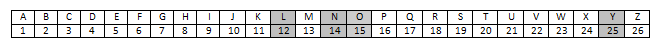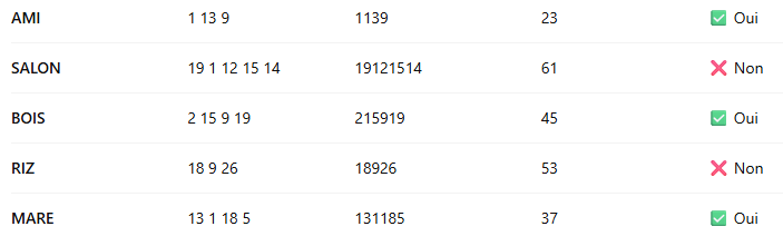On obtient alors la chaîne de caractères composée des indices concaténés dans le bon ordre des lettres qui composent le mot choisi, ainsi au mot « LYON » est associé la chaîne de caractères « 12251514 ».