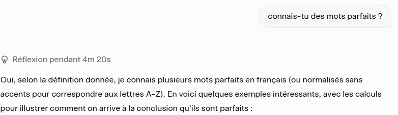 Assurément, la liste des mots parfaits français est finie. En effet, au delà d’un certain rang, correspondant probablement au mot intergouvernementalisations, nouveau mot officiellement le plus long, il n’y a plus aucune chance de trouver des mots qui ont un sens même s’ils ont la propriété arithmétique recherchée.