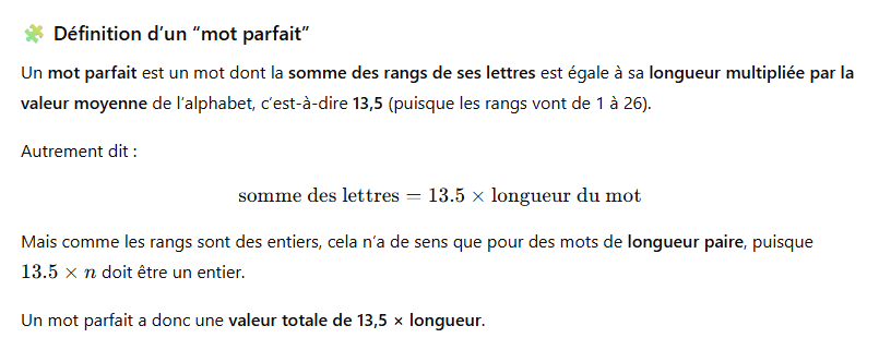 Si les nombres sont composés de chiffres, les mots sont composés de lettres. Justement, dans le domaine des lettres, l’harmonie est souvent le but des écrivains, vient alors peut-être assez facilement l’idée de rechercher un mot parfait ou un mot « égal à la somme de ses parties aliquotes ». Il reste à définir ce qu’on entend par cette « définition » plaquée d’un concept mathématique.
