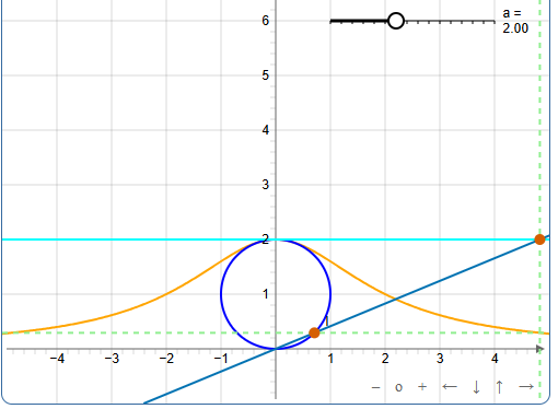 La courbe d’Agnesi est le lieu de l’intersection des droites en pointillé, on peut voir comment est faite la construction en bougeant le point I sur le cercle. Le paramètre a peut être modifié en réglant le curseur.