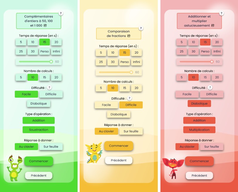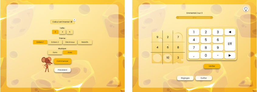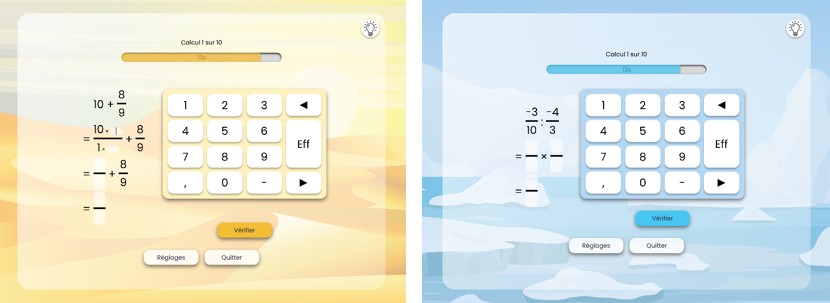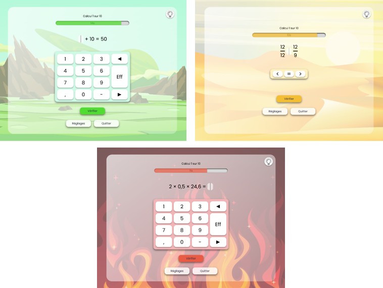 Le jeu est proposé avec différents thèmes de calcul : entiers, décimaux, relatifs et expressions littérales.