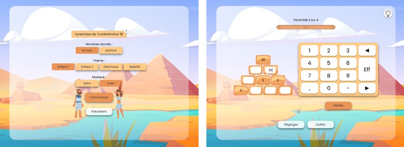 En février 2026, un nouveau jeu voit le jour : les Pyramides de Toutânkhalkul. Le principe est de compléter des pyramides de nombres, le plus rapidement possible, de sorte que chaque nombre dans une case soit égal à la somme des deux nombres situés dans les cases en-dessous. Un classique mais proposé dans un bel univers égyptien, avec des pyramides aléatoirisées et pouvant être donné, comme les autres jeux, sous forme de travail à la maison ou sous forme de live session aux élèves.