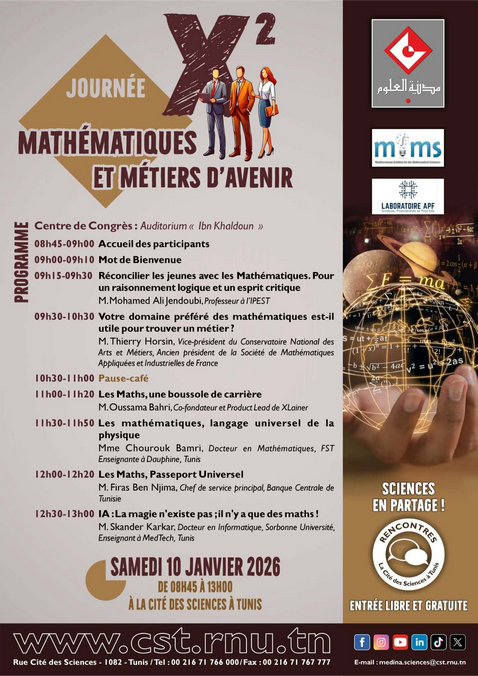 Le 10 janvier 2026, la Cité des Sciences à Tunis a organisé en collaboration avec l’Association Méditerranéenne des Sciences Mathématiques (MIMS) la Journée “Mathématiques et Métiers d’Avenir “, un événement phare visant à éclairer le rôle essentiel de la pensée mathématique dans le paysage professionnel contemporain et futur, que ce soit en Tunisie ou dans le monde.