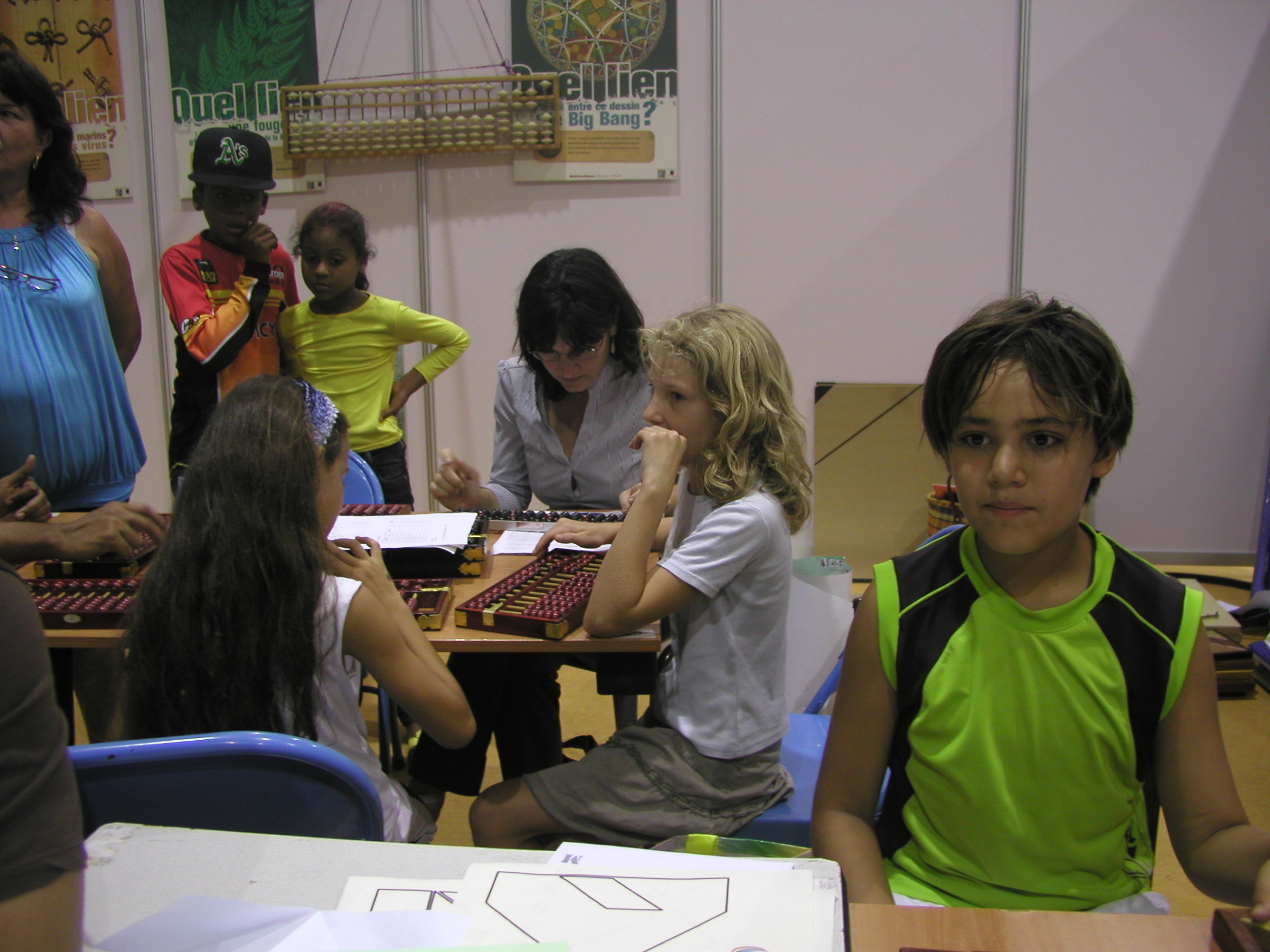– une petite fille de 7 ans qui se prénomme Jade a été laissée au stand avec sa petite sœur. Elles sont restées 2 heures. Jade a été immédiatement passionnée par la manipulation du boulier et ne voulait pas partir. Elle me demandait sans arrêt un nouveau nombre à afficher puis elle me demandait si ce qu’elle avait fait était juste !