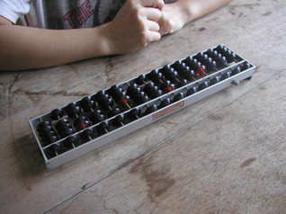 Voici le boulier que j’ai utilisé pendant le stage, hyper pratique pour sa remise à zéro automatique. Mon Maître me l’avait offert en partant ainsi que de nombreux autres cadeaux pédagogiques pour les classes. Dont un boulier aux boules vertes hexagonales [3] qui glissaient avec frottement afin de rester en place malgré la gravité [4], et un énorme boulier pour tableau aux boules hexagonales en os qui elles-aussi glissaient avec frottement.