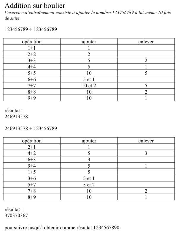 Parmi les exercices les plus efficaces pour apprendre le boulier et passer en revue toutes les règles de calcul, ce serait, pour commencer de manière progressive :