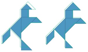 Dans le cas de l’image de gauche, on peut voir qu’une erreur a été commise. On le voit bien puisque pour la tête du cheval, le contour dépasse. Ce qui signifie que la figure placée n’est pas la bonne, elle est trop petite. Quant à la jambe, on voit que le triangle est trop grand par rapport au contour. Il est ensuite possible d’annuler la vérification et de déplacer les pièces pour se corriger s’il le faut.