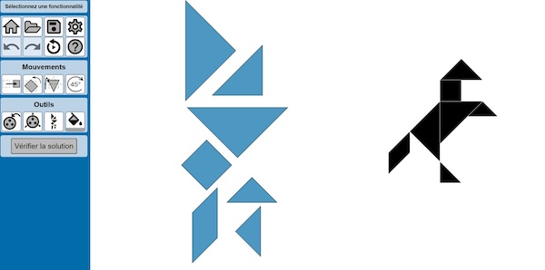 Le premier niveau propose, à droite, un modèle où les pièces ont la même taille que celles à assembler à gauche, avec les lignes de séparations des différentes pièces. Les élèves peuvent glisser les pièces sur le modèle pour vérifier qu’ils ont pris la pièce de tangram qui convient.