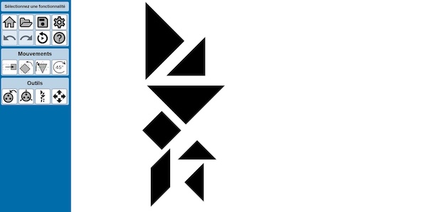 Le dernier, « Tourner de 45º », permet de faire tourner la figure de 45º dans le sens des aiguilles d’une montre en cliquant dessus. Ce mouvement permet d’éviter des ajustements qui sont souvent nécessaires avec le mouvement « Tourner ». L’angle de 45º est très pratique pour reproduire les figures du Tangram.