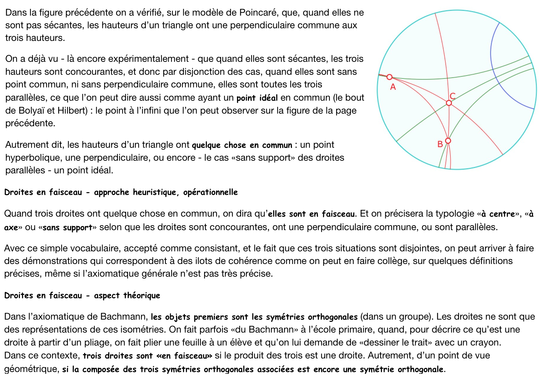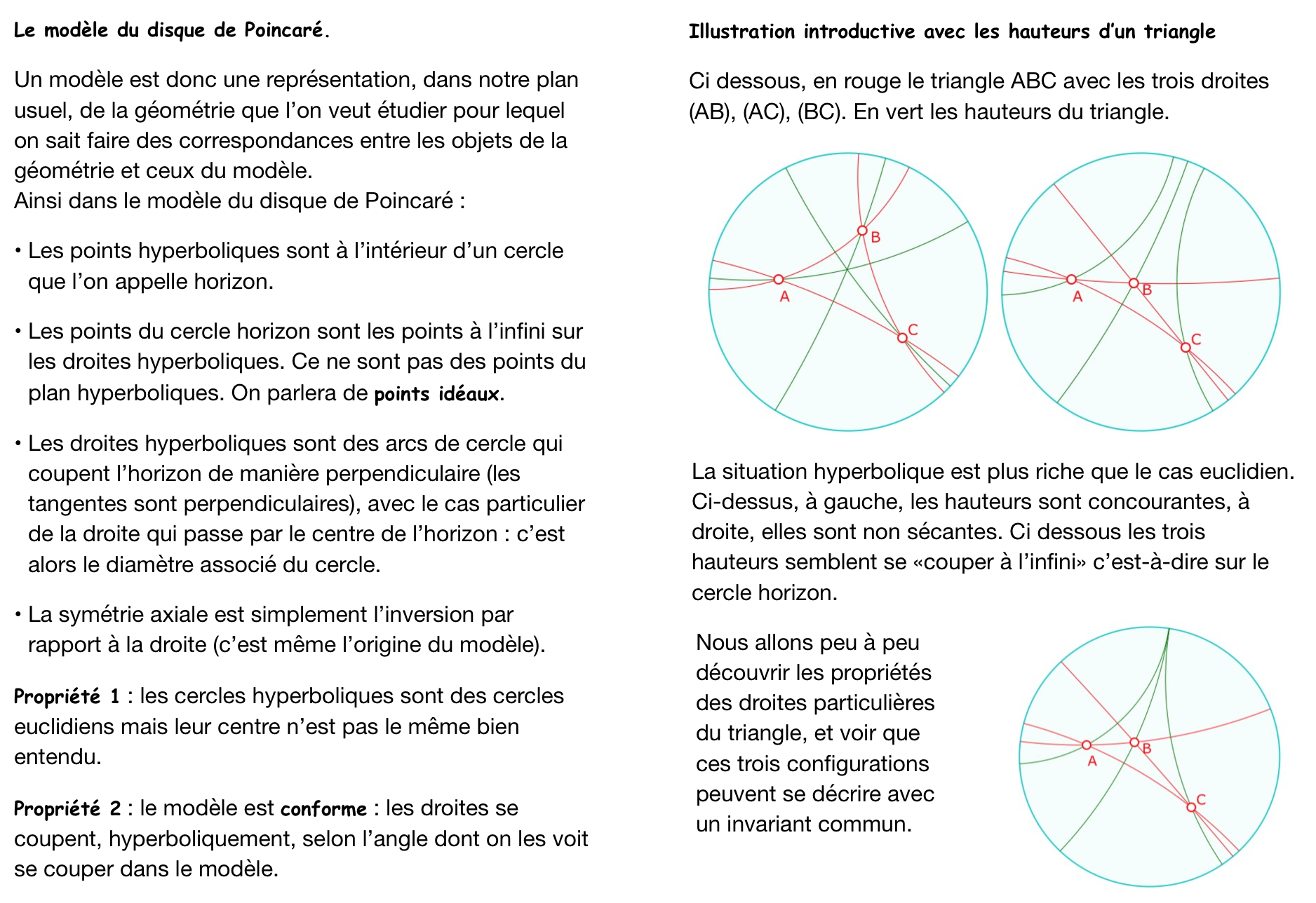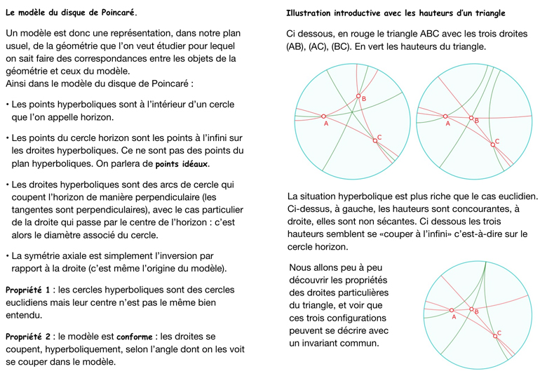La principale question préalable des stagiaires est celle du modèle : ils demandent - de manière récurrente - comment sont construites les droites, et l’orthogonalité, pensant que cette connaissance permettra d’anticiper les propriétés géométriques hyperboliques. La réponse renvoie à la pratique géométrique scolaire : qu’est-ce qu’une droite pour un élève de 5° ? L’orthogonalité ? Nous nous plaçons dans le même contexte : un modèle donné, avec ses outils, virtuels, certes, mais équivalent des objets physiques correspondants. Ci-dessous un bloc qui précise un peu le contexte (cliquer pour le déplier)