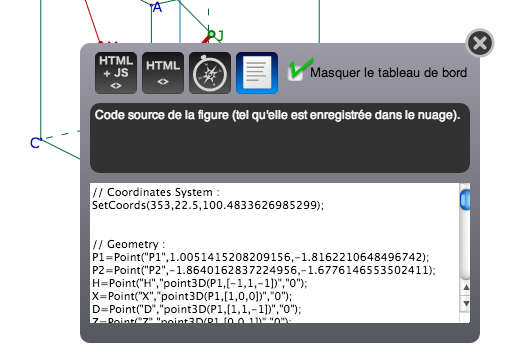 Coordonnées 3D : on clique simplement sur le point dont on veut les coordonnées (sans avoir à montrer le repère, la macro le retrouve). La macro renvoie une expression formée d’une liste de trois termes. Voici une copie d’écran d’un exemple de base :