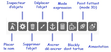 Ci-dessous, la palette actuelle (2020) de DGPad, en particulier avec son icone Blockly mais lors de l’écriture de cet article il s’agissait de présenter l’icone Ancre. Pour Blockly voir les liens en fin d’article.
