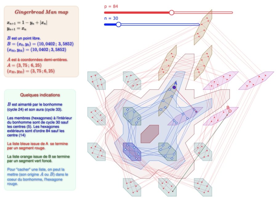 Exemple avec l’algorithme GingerBreadMan (GGBM) dont la condition initiale (point A) est aimantée par tous les points représentés par une croix. Vous pouvez modifier le style en choisissant l’icone « roue » dans le tableau de bord.
