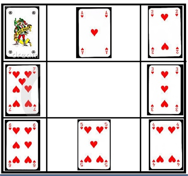 - Pour commencer, tu peux déplacer seulement les 4 cartes : l’as, le 7, le 5 ou le 3