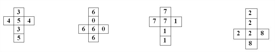 Tu disposes des 4 dés spéciaux ci-dessous. La somme des nombres inscrits sur les faces de chacun d’eux est 24.
